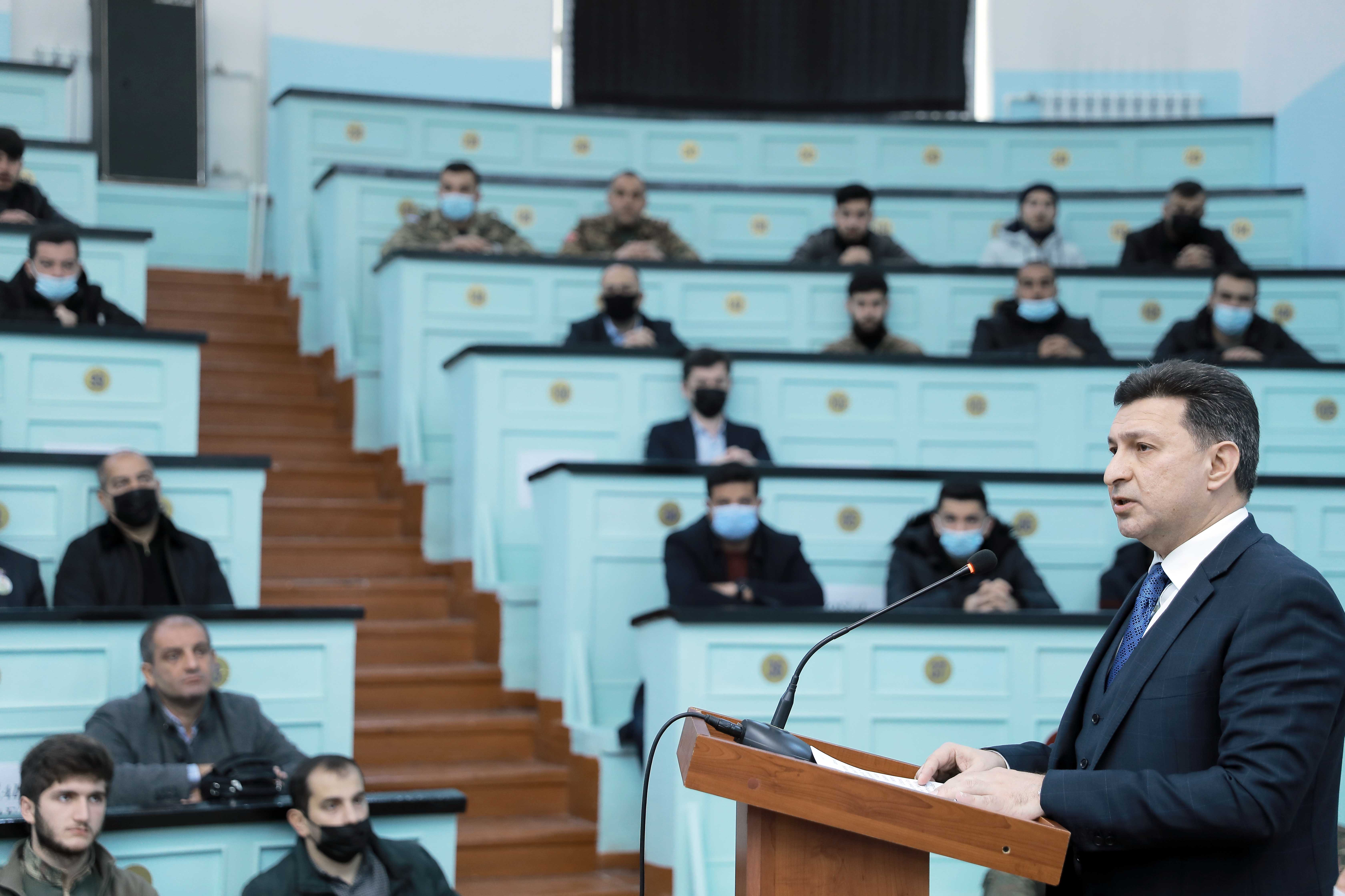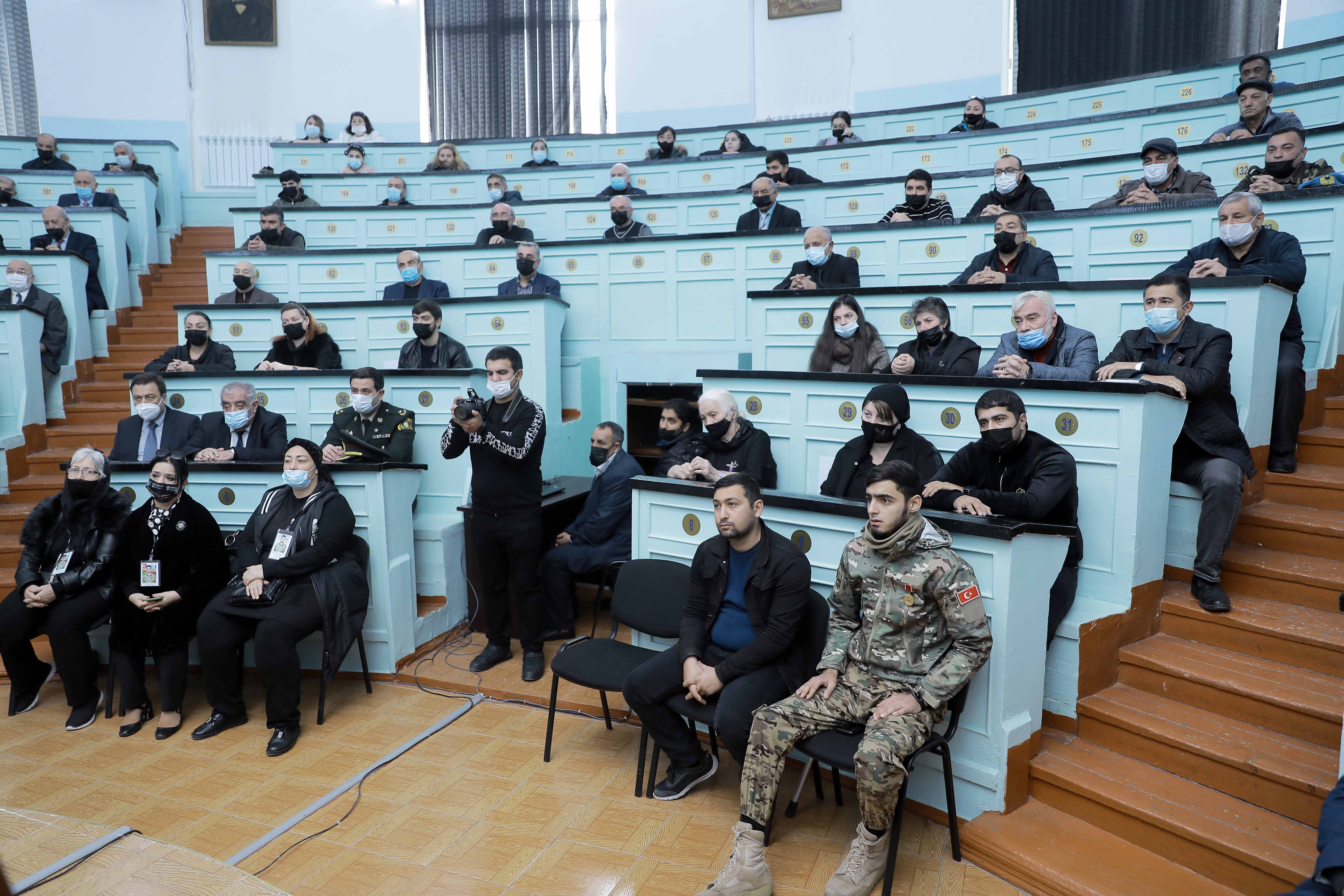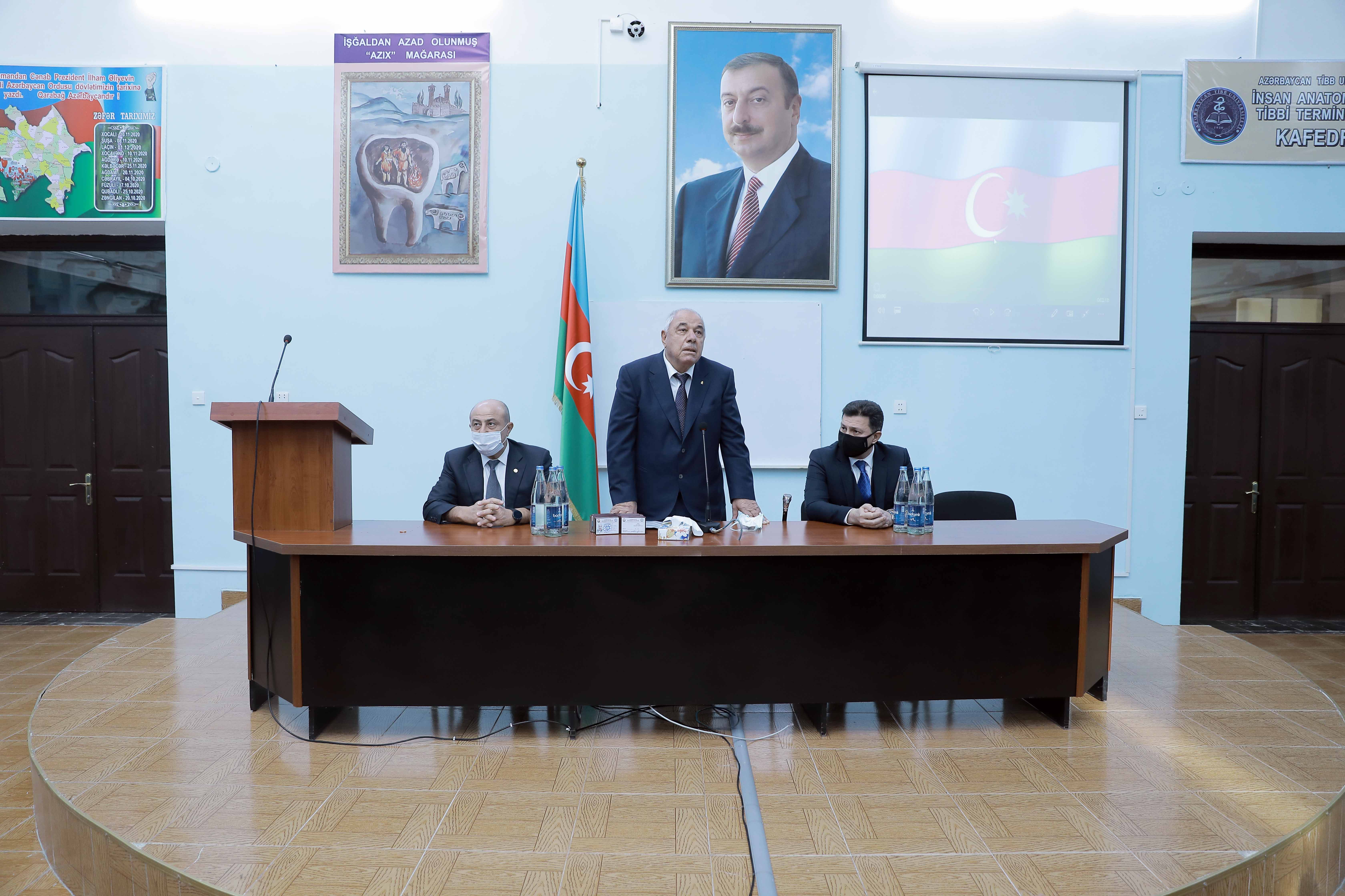 Azərbaycan Tibb Universitetinin rektoru, professor Gəray Gəraybəyli çıxışında 44 günlük savaş nəticəsində ərazi bütövlüyümüzü bərpa edən Azərbaycan Ordusunun tarixi nailiyyətlərə imza atdığını bildirib: “Vətən müharibəsi prezidentimiz, Ali Baş Komandan İlham Əliyevin qətiyyətli iradəsi, müzəffər ordumuzun qəhrəmanlığı nəticəsində zəfərlə başa çatdı. Bu tarixi qələbə əbədiyaşar şəhidlərimizin qanı, mərd qazilərimiz hesabına qazanıldı. Azərbaycan müstəqillik tarixinə qızıl hərflərlə yazıldı. böyük qürur hissi ilə qeyd etmək istərdim ki, 44 günlük böyük Vətən müharibəsində şanlı tarix yazan şəhidlərimizdən 2-nin valideyni bizim universitetimizin əməkdaşıdır”. Professor G.Gəraybəyli Vətən müharibəsində həm ön, həm də arxa cəbhədə yaralı əsgərlərə xidmət göstərən tibb işçiləri, həkimlər, tibb bacıları barədə də məlumat verib. Qeyd edib ki, şəhidlərimizin arasında 42 nəfər tibb işçisi var, onlardan 18-i ATU-nun Hərbi tibb fakültəsinin məzunlarıdır. Çıxışının sonunda ATU rektoru şəhidlərin valideynləri, ailə üzvləri qarşısında baş əydiyimizi deyib.
