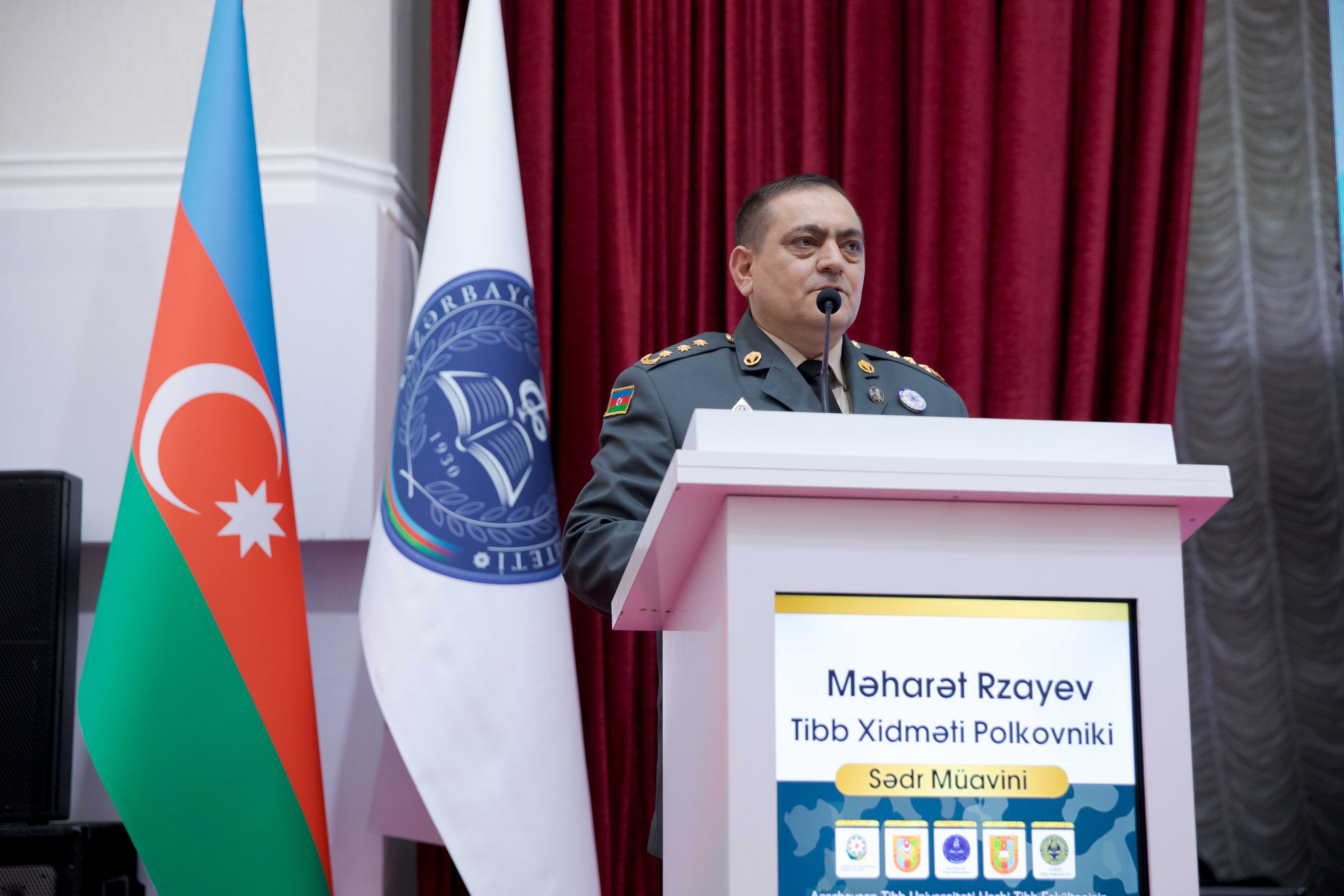 Hərbi tibb fakültəsinin rəisi, tibb xidməti polkovniki Məharət Rzayev çıxış edərək, may ayının əlamətdar günlərlə zəng olduğunu bildirib. Ulu Öndərin dünyaya gəlişinin, Müstəqillik Gününün, Hərbi tibb fakültəsinin yaradılmasının bu əlamətdar günlər sırasında olduğunu diqqətə çatdırıb: “Ölkəmizdə hərbi tibb sistemində savadlı və yüksək hazırlıqlı tibbi kadrların hazırlanması dövlətimizin hərbi təhlükəsizlik strategiyasında mühüm yer tutur. Bu məqsədə nail olunmasında Hərbi tibb fakültəsinin əvəzsiz rolu danılmazdır. Bu fakültənin fəaliyyəti illərdir ki, gələcək hərbi həkimlərin yalnız nəzəri biliklərə deyil, eyni zamanda onların döyüş şəraitində, ekstremal tibbi situasiyalarda düzgün qərarvermə bacarığına yiyələnməsinə, elmi-pedaqoji potensiala və vətənpərvərlik ruhuna əsaslanır. Bu uğurların mərkəzində isə, sözsüz ki, zəngin elmi və hərbi təcrübəyə malik olan Hərbi tibb fakültəsinin kollektivi dayanır”.